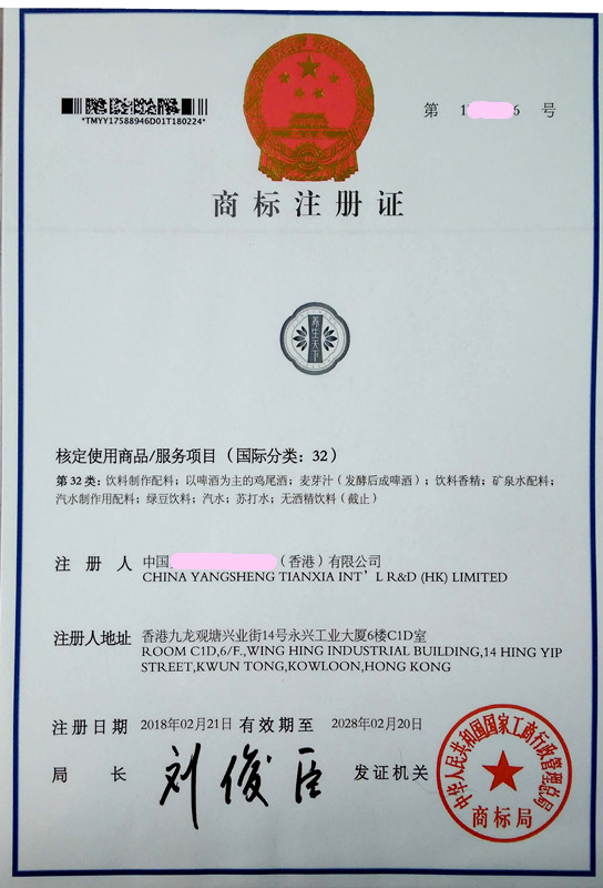您委托我所代理商标注册申请,名称为“养生天下” 32类商标注册证已下达。