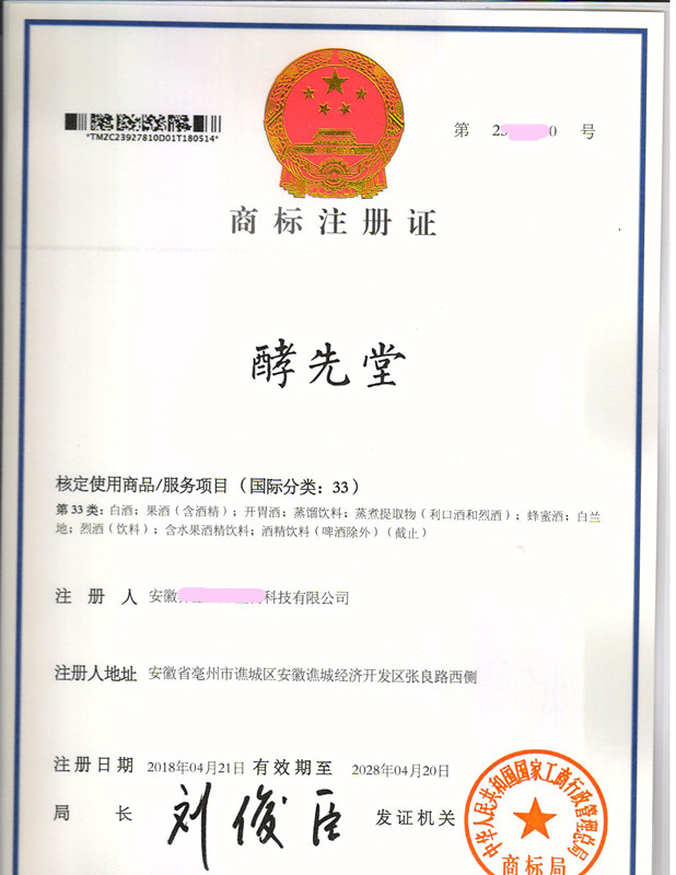 您委托我所代理商标注册申请,名称为“酵先堂”33类商标注册证已下达。