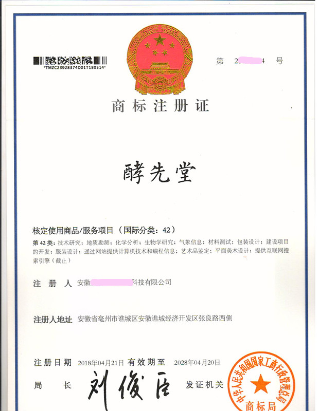 您委托我所代理商标注册申请,名称为“酵先堂”42类商标注册证已下达。