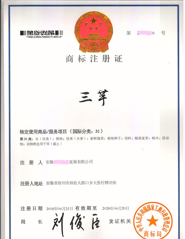 您委托我所代理商标注册申请,名称为“三芋”31类商标注册证已下达。