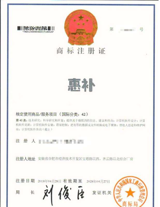 您委托我所代理商标注册申请,名称为“惠补”42类商标注册证已下达。