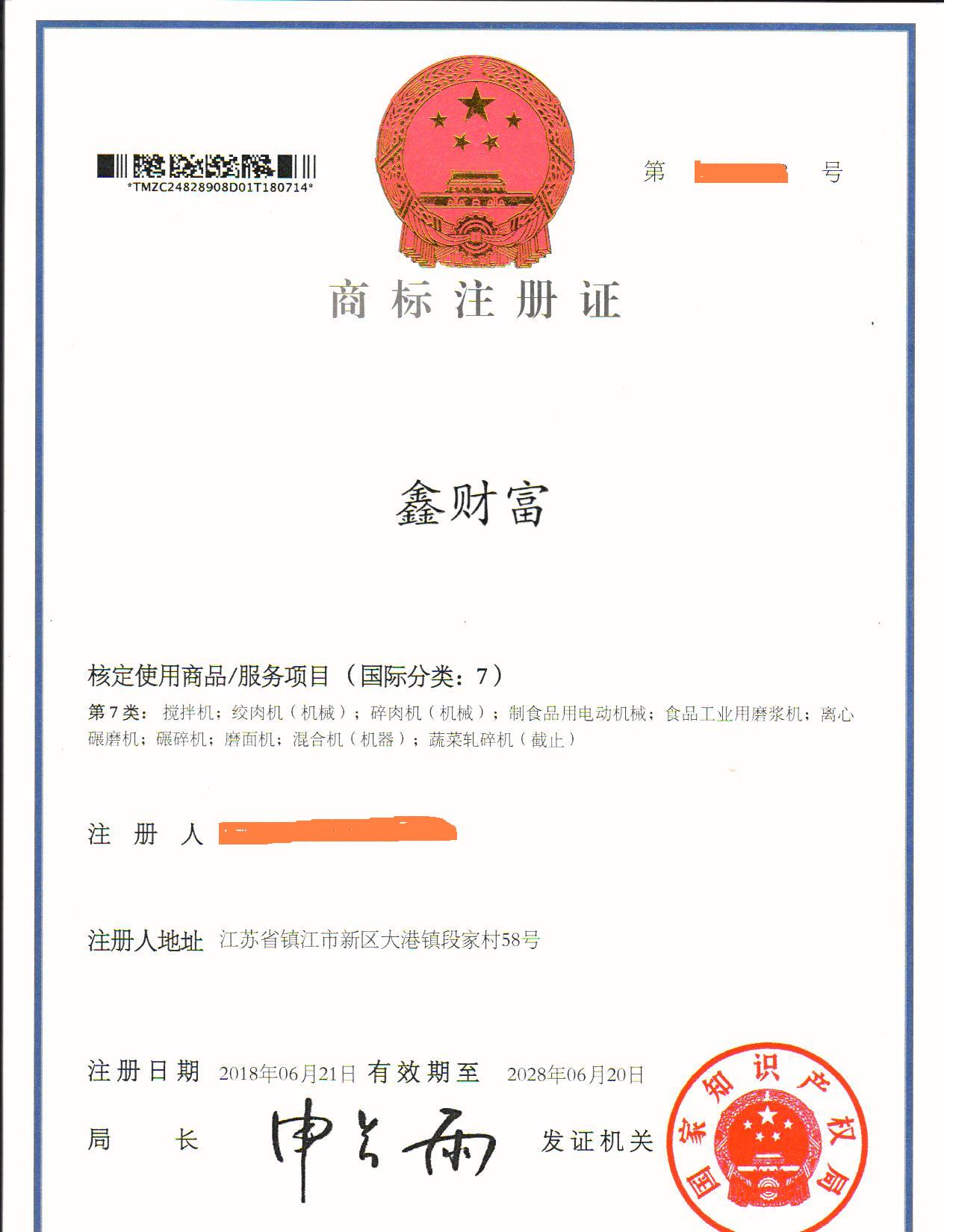 您委托我所代理商标注册申请,名称为“鑫财富”7类商标注册证已下达。