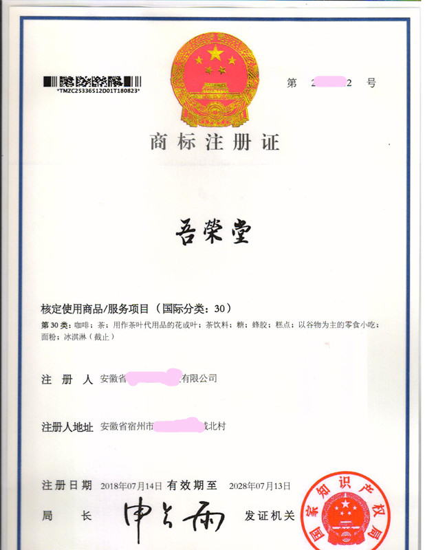 “吾荣堂”30类商标注册证下达